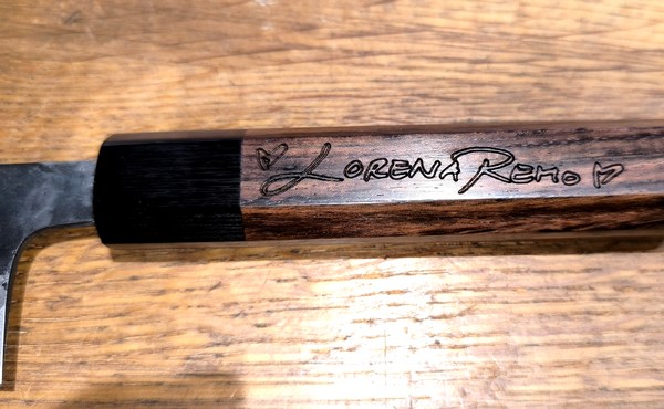 Optional besteht die Möglichkeit die Gravur auf dem Griff anzubringen wie hier im Beispiel von einem handgeschriebenen Text.